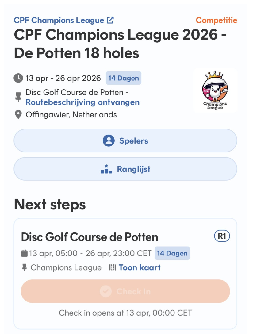 LET OP: Om een score neer te zetten moet je je echt aanmelden / inchecken voor het event dat hoort bij de Champions League en daar je score neerzetten. Alleen het spelen van een rondje op de layout is NIET voldoende en telt niet mee.