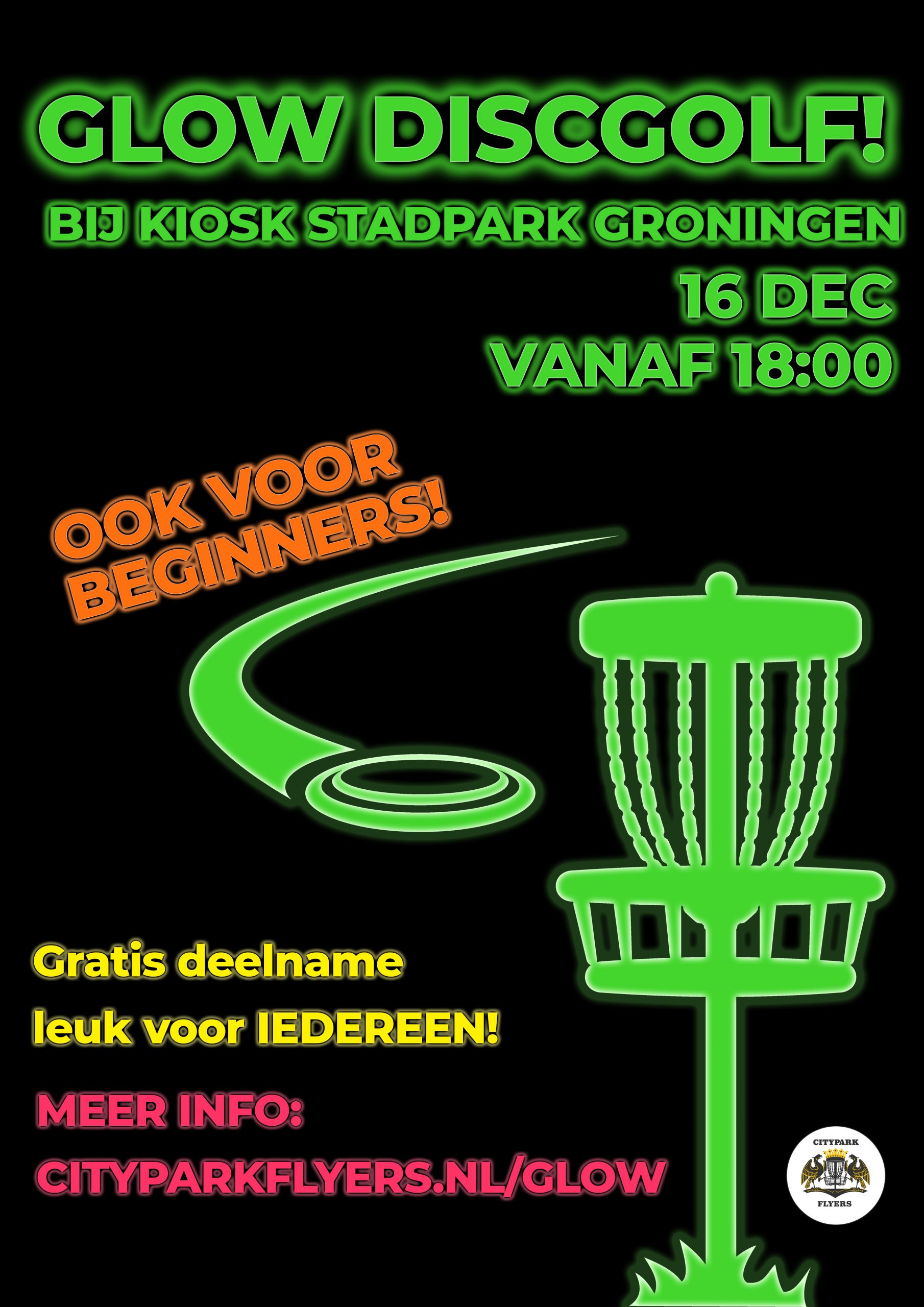 Pak uw agenda erbij, want 16 december MOET je echt noteren voor een superleuk event in het Stadspark: Glow Discgolf! Een 9-hole layout voor gevorderden (registratie nodig) en een 6-hole beginnerscourse voor iedereen. Leuke sfeer, warme chocolademelk en een boel plezier op een mooi verlichte baan. Je leest er alles over, inclusief registratielink op de site: www.cityparkflyers.nl/glow/